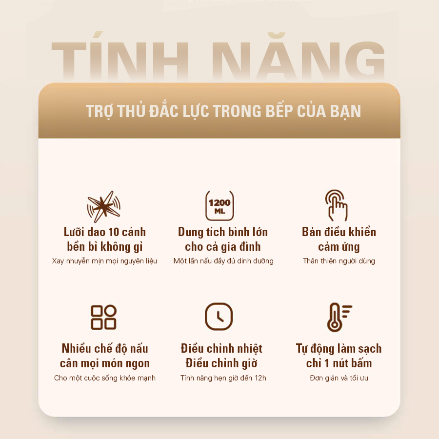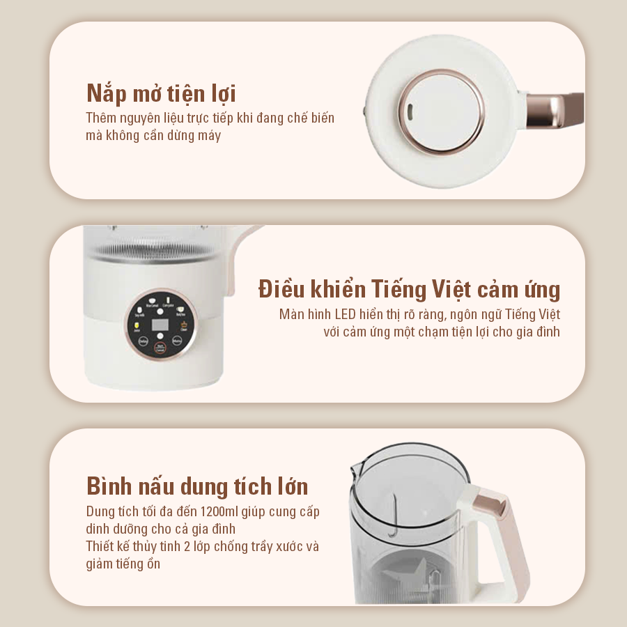 6 chức năng đa năng – Nấu sữa hạt, sữa bắp, thức ăn dặm, nước ép, đun trà, tự động vệ sinh 1 chạm, đáp ứng mọi nhu cầu chỉ trong 1 máy.